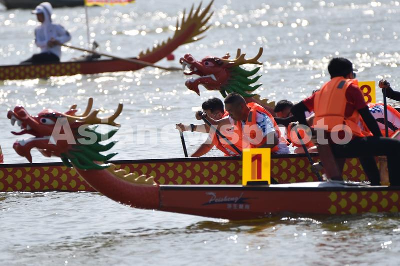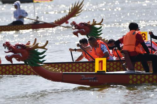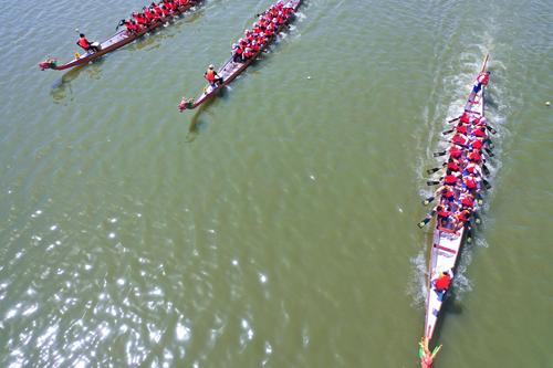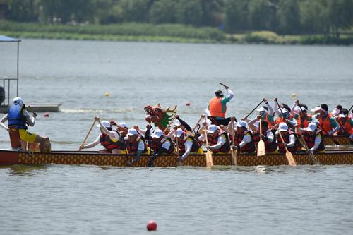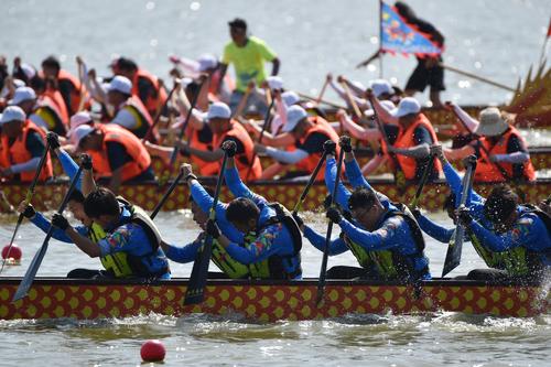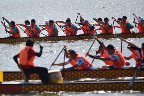 2021年6月6日,在江苏南京玄武湖,参赛龙舟队在比赛中。