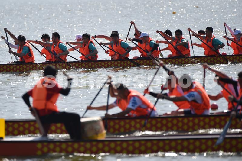 2021年6月6日,在江苏南京玄武湖,参赛龙舟队在比赛中。