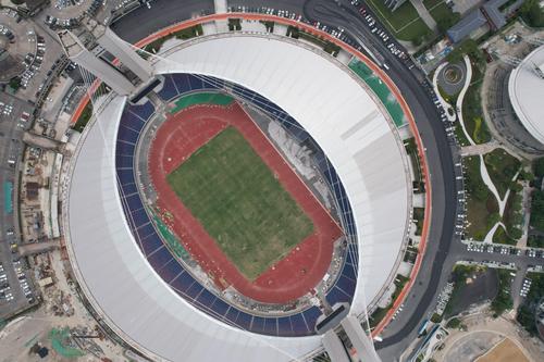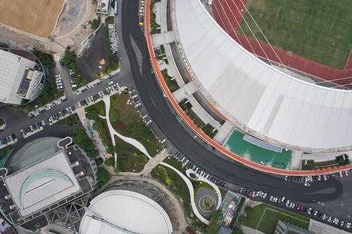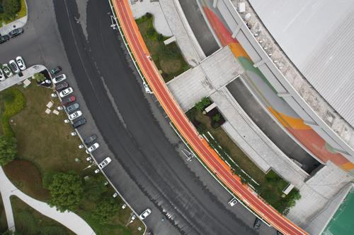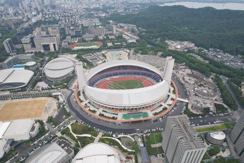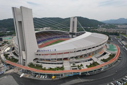 图片说明:2021年6月7日,杭州黄龙体育场新增的环行空中跑道(西区)基本铺设完成。