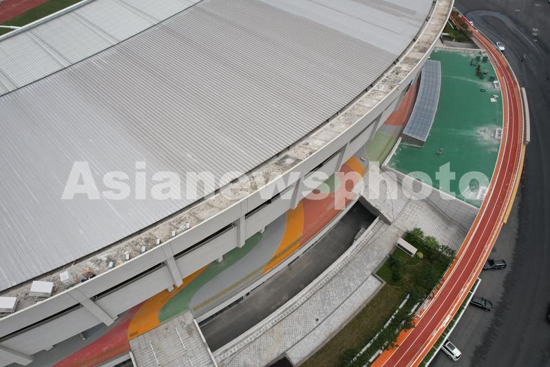 图片说明:2021年6月7日,杭州黄龙体育场新增的环行空中跑道(西区)基本铺设完成。