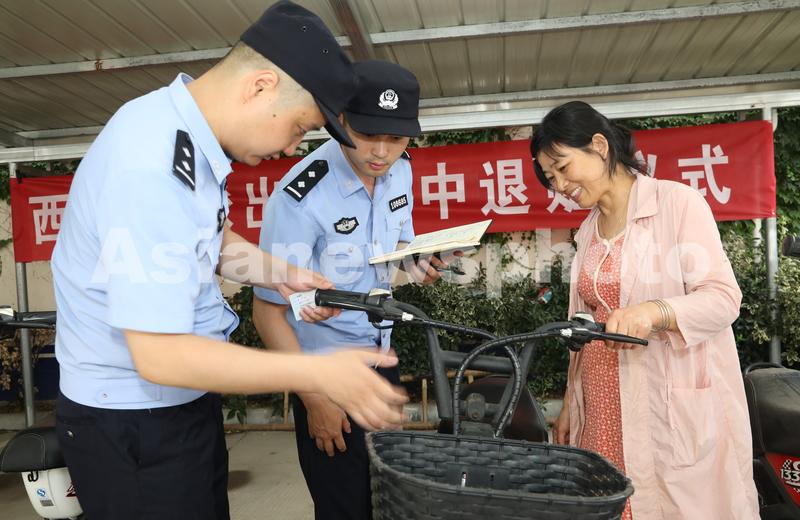 2021年6月11日,在江苏省扬州市宝应县公安局西安丰派出所,一位群众领到失而复得的电动车。