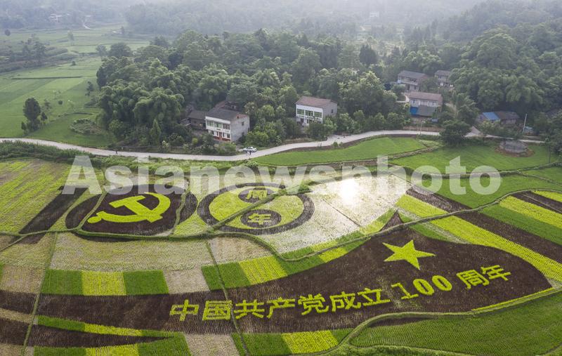图片说明:2021年6月13日,四川省广安市广安区彭家乡茶店村稻田里,用彩色水稻绘制出的“中国共产党成立100周年”文字和党徽及“100”图案。