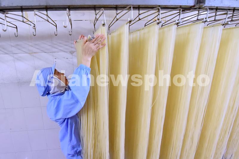 2021年6月10日,江西省赣州市会昌县一家食品公司车间里,工人在米粉烘干生产线上忙碌。