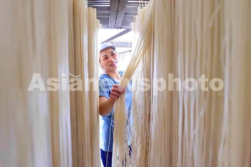 2021年6月10日,江西省赣州市会昌县一家食品公司车间里,工人在检查米粉韧度。