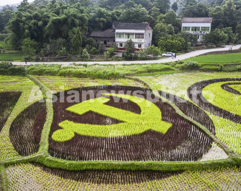 图片说明:2021年6月13日,四川省广安市广安区彭家乡茶店村稻田里,用彩色水稻绘制出的党徽图案。