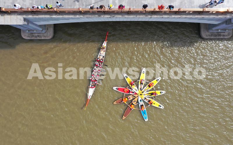 图片说明:2021年6月14日上午,武汉经济技术开发区(汉南区)欧洲小镇马影河上举行民间龙舟表演赛。
