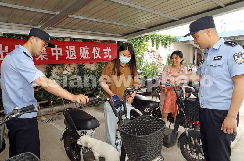2021年6月11日,在江苏省扬州市宝应县公安局西安丰派出所,群众领到被盗的车辆。当日,江苏省扬州市宝应县公安局西安丰派出所举行被盗车辆集中发还仪式,将此前破案追回的价值2万余元的电动车发还给群众,为他们挽回经济损失。