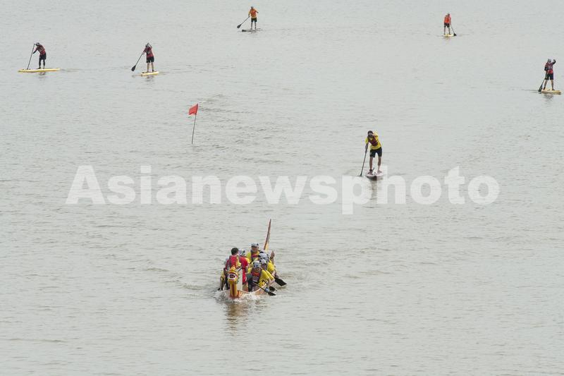 图片说明:2021年6月14日上午,武汉经济技术开发区(汉南区)欧洲小镇马影河上举行民间龙舟表演赛。