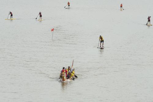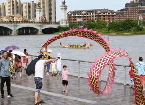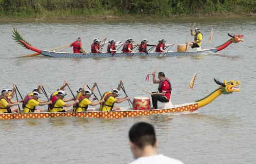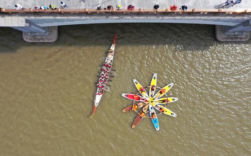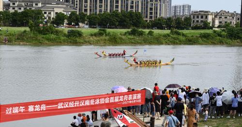 图片说明:2021年6月14日上午,武汉经济技术开发区(汉南区)欧洲小镇马影河上举行民间龙舟表演赛。