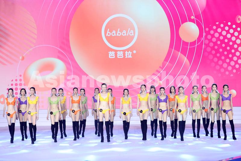2021年06月12日晚,女子组选手在中国职业模特大赛总决赛上进行泳装环节的展示。