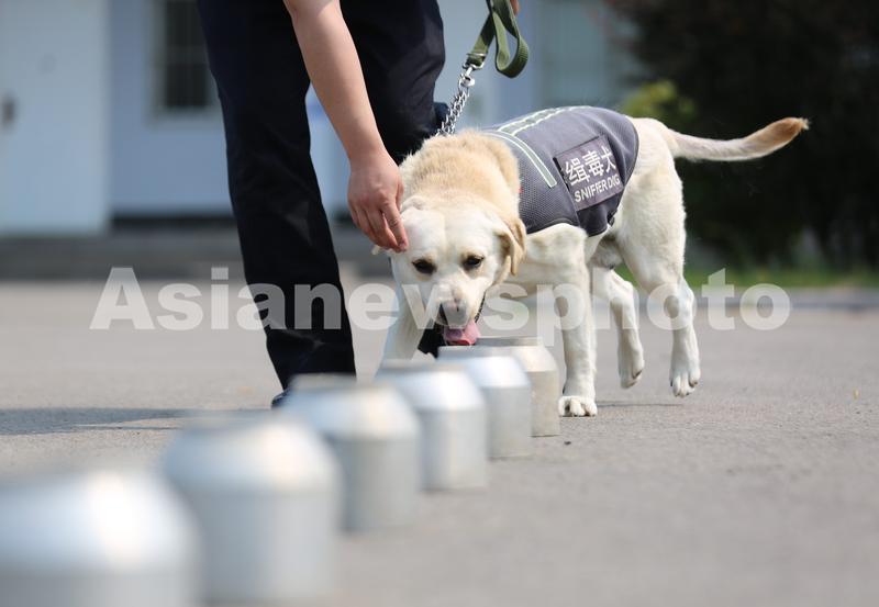 6月23日,在山东省沂南县公安局举办的“缉毒犬开放日”活动上,一只缉毒犬进行嗅毒表演。