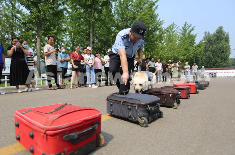6月23日,在山东省沂南县公安局举办的“缉毒犬开放日”活动上,一只缉毒犬进行箱包藏毒查缉表演。