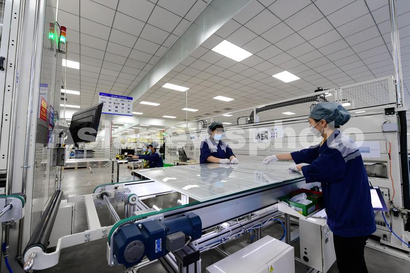 2021年6月22日,浙江义乌,义乌晶澳太阳能科技有限公司智造工厂数字化车间里,产线工人正在工作岗位上操作半成品组件。