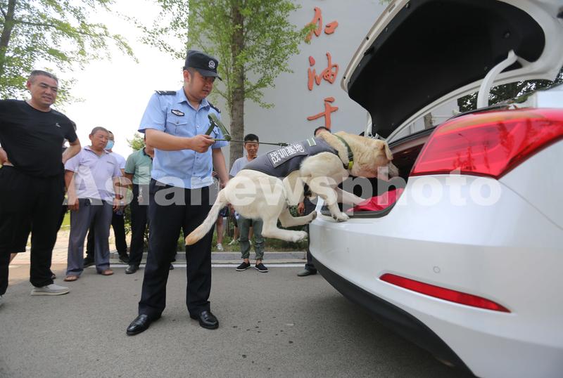 6月23日,在山东省沂南县公安局举办的“缉毒犬开放日”活动上,一只缉毒犬进行车体藏毒查缉表演。