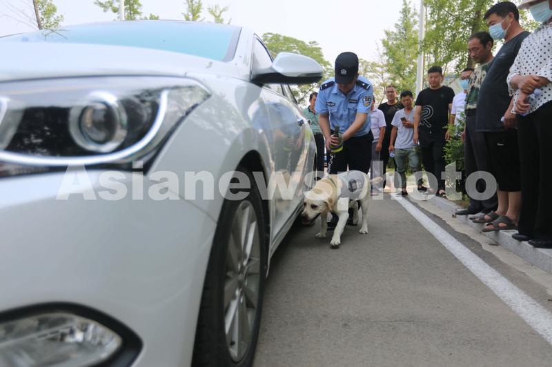 6月23日,在山东省沂南县公安局举办的“缉毒犬开放日”活动上,一只缉毒犬进行车体藏毒查缉表演。