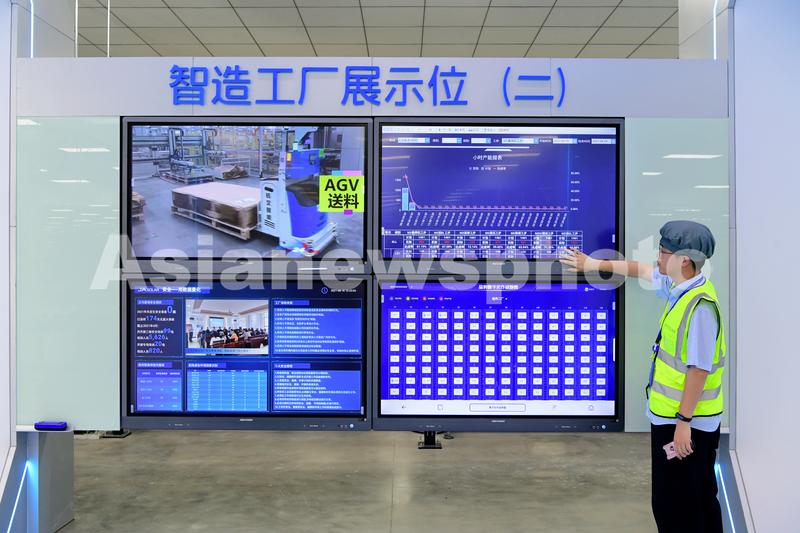 2021年6月22日,浙江义乌,义乌晶澳太阳能科技有限公司智造工厂,一位员工在智能展示看板前展示数字化车间地图内容。