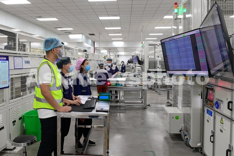 2021年6月22日,浙江义乌,义乌晶澳太阳能科技有限公司智造工厂数字化车间里,产线工人正在生产线上操作自动化检测设备。