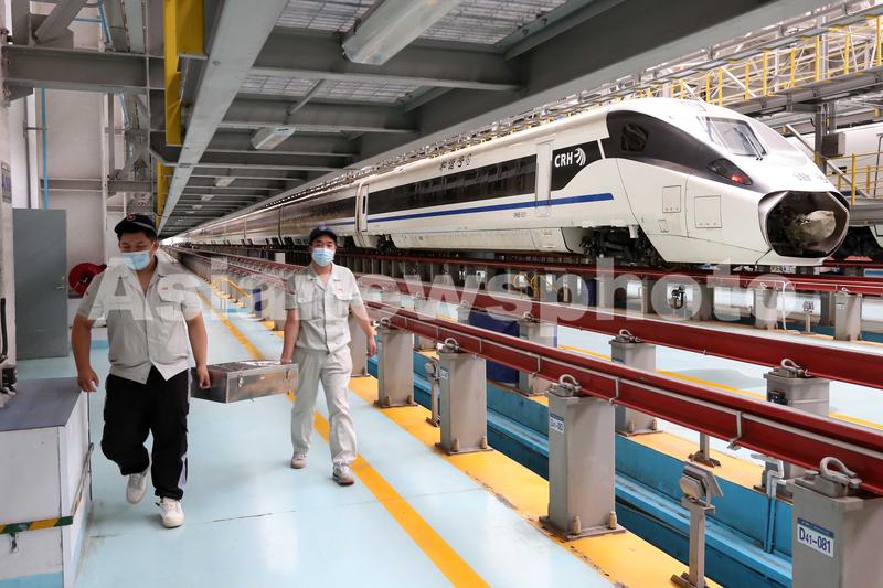 2021年6月25日,工作人员在乌鲁木齐铁路局客车检修基地检查保养即将投入使用的CRH5E长编动卧列车。