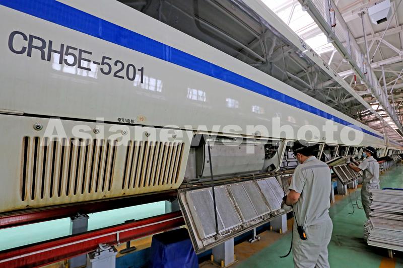 2021年6月25日,工作人员在乌鲁木齐铁路局客车检修基地检查保养即将投入使用的CRH5E长编动卧列车。