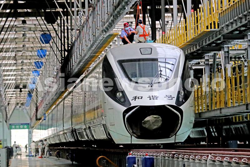 2021年6月25日,工作人员在乌鲁木齐铁路局客车检修基地检查保养即将投入使用的CRH5E长编动卧列车。