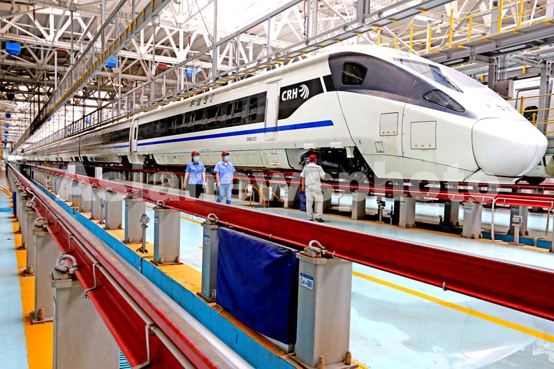 2021年6月25日,工作人员在乌鲁木齐铁路局客车检修基地检查保养即将投入使用的CRH5E长编动卧列车。