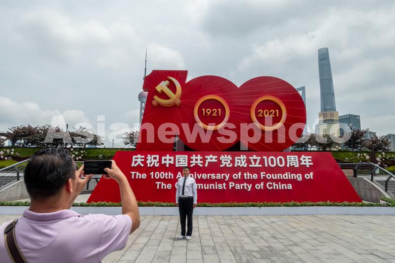 2021年6月30日,上海,“庆祝中国共产党成立100周年”巨型标识亮相外滩金牛广场,吸引众多游客和市民拍照留影。