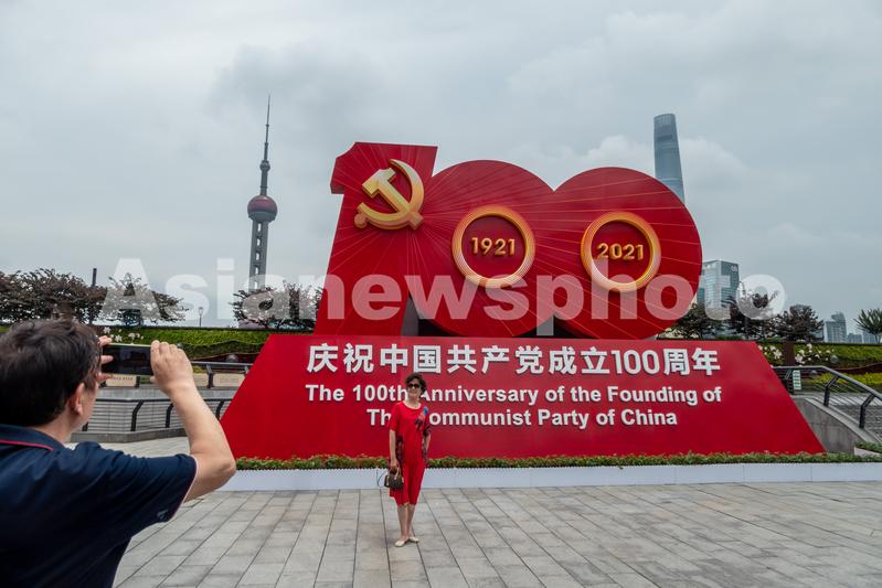 2021年6月30日,上海,“庆祝中国共产党成立100周年”巨型标识亮相外滩金牛广场,吸引众多游客和市民拍照留影。