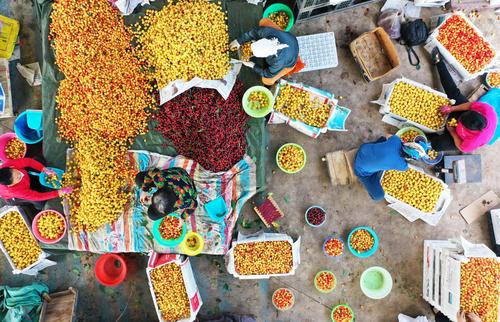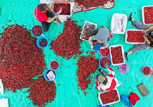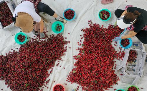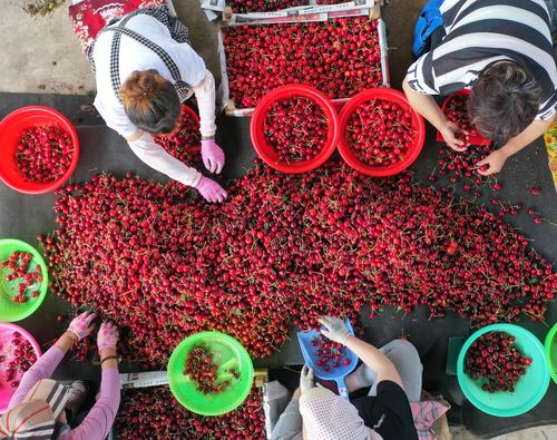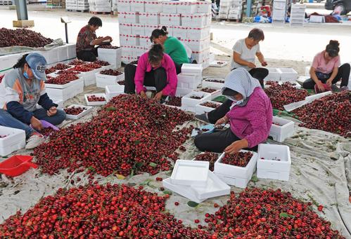 2021年7月5日,大连市金普新区七顶山街道老虎山村的樱桃批发市场内一派繁忙景象,当地果农在销售晚熟樱桃。女工们精选晚熟的樱桃已经被北京、上海、内蒙古等地的客商提前预定,晚红珠、友谊、冰库等晚熟樱桃品种尽管上市晚约10天,但是这些樱桃要比中期上市的樱桃每市斤最低多卖5元钱。