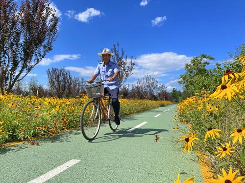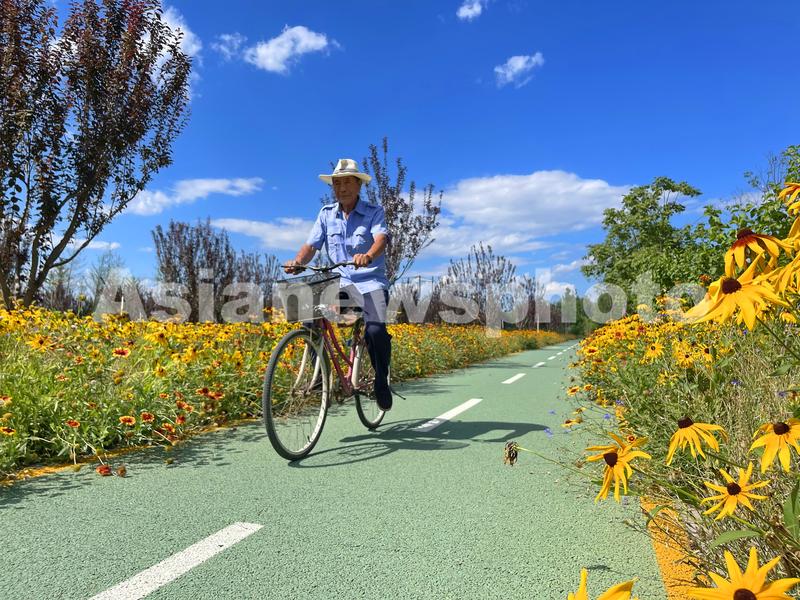 图片说明:2021年7月4日,市民在北京城市副中心潮白河森林景观带生态环保绿道上骑行。