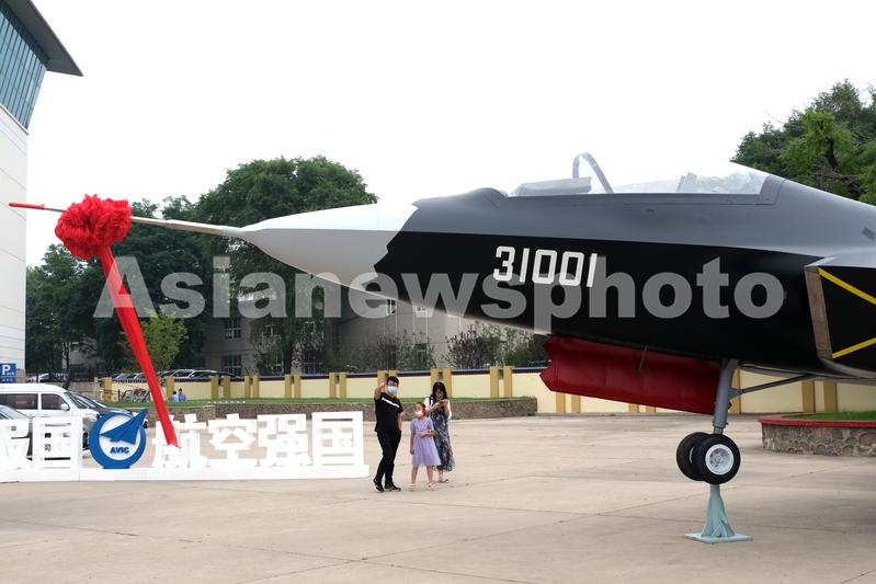 图片说明:2021年7月7日,辽宁沈阳,观众在沈飞航空博览园观看“鹘鹰”(歼-31)战机。
