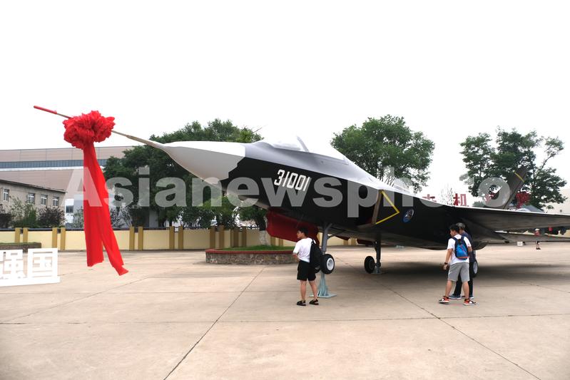 图片说明:2021年7月7日,辽宁沈阳,观众在沈飞航空博览园观看“鹘鹰”(歼-31)战机。