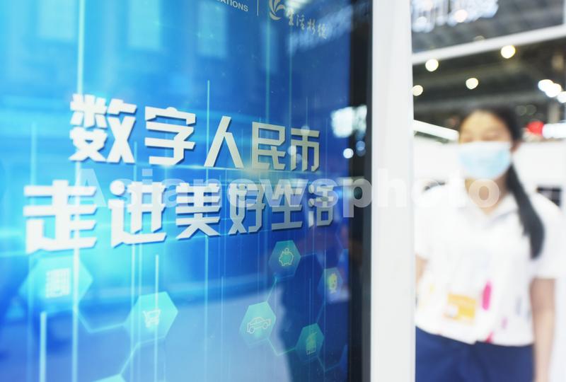 图片说明:2021年7月7日,在2021世界人工智能大会上拍摄到的数字人民币标识。