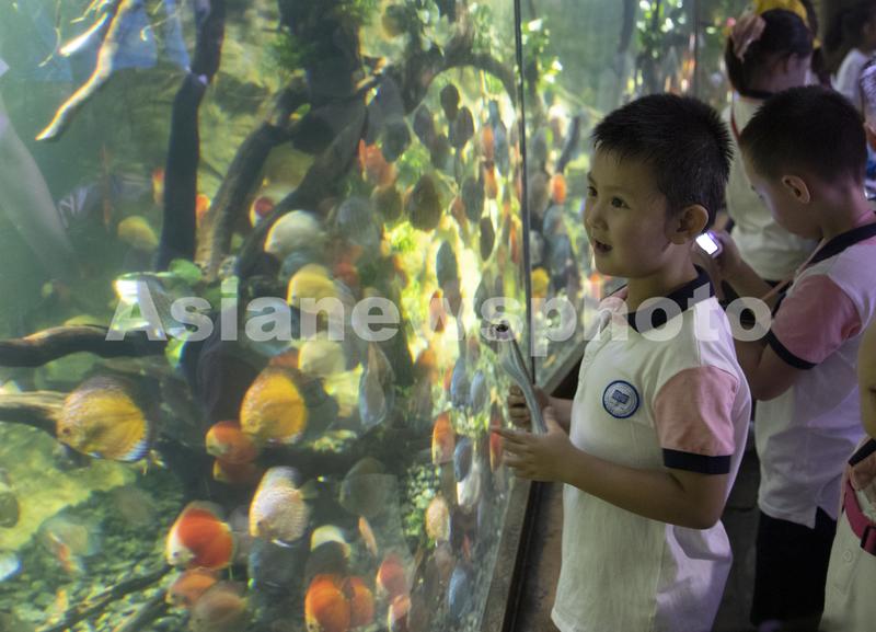 小朋友们欣赏生态缸内的七彩神仙鱼。
