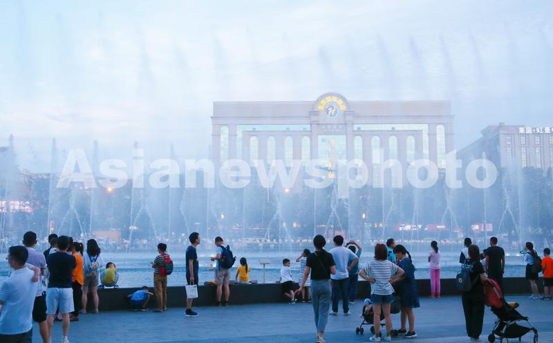 2021年7月17日,上海,爱琴海购物公园的音乐喷泉艺术水秀夜景吸引众多市民和消费者驻足观赏。