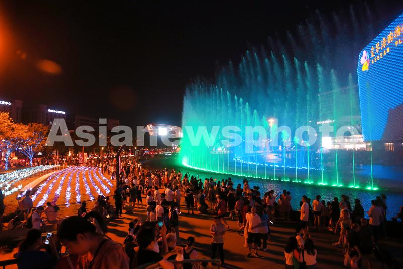 2021年7月17日,上海,爱琴海购物公园的音乐喷泉艺术水秀夜景美轮美奂,吸引众多市民和消费者驻足观赏,网红文化旅游消费新地标催热夜上海夜经济发展。