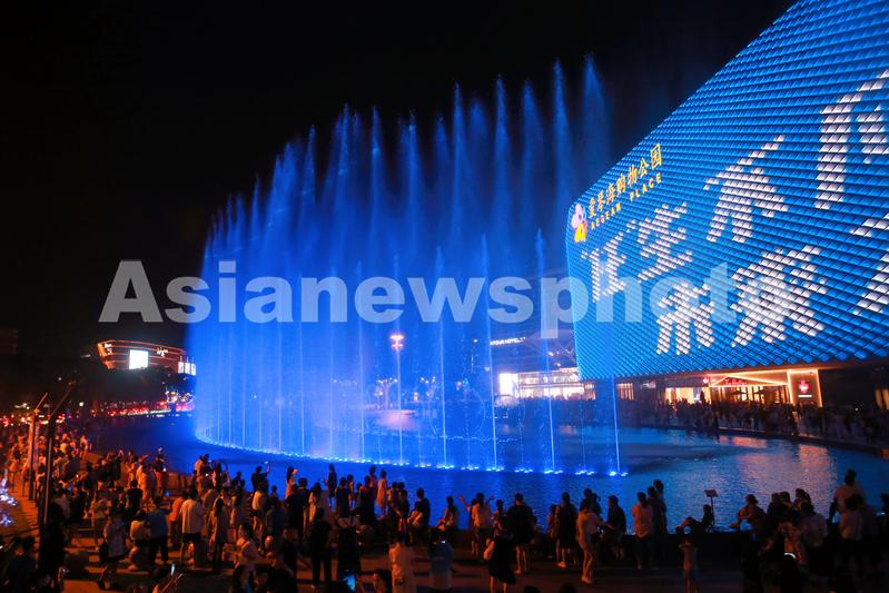 2021年7月17日,上海,爱琴海购物公园的音乐喷泉艺术水秀夜景吸引众多市民和消费者驻足观赏。