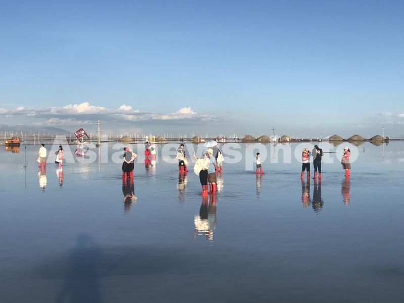 图片说明:2021年7月17日,游客在青海茶卡盐湖观光。