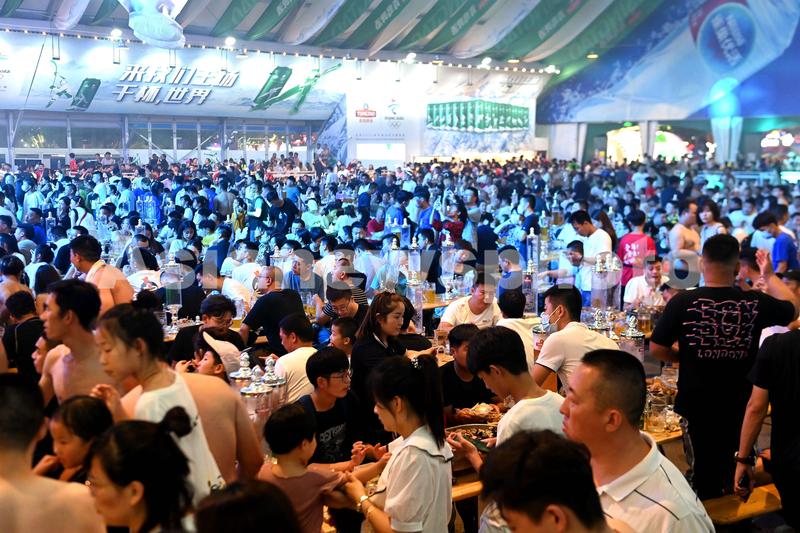 2021年7月18日,山东青岛西海岸新区金沙滩啤酒城,市民和游客在啤酒大棚内喝啤酒和狂欢。