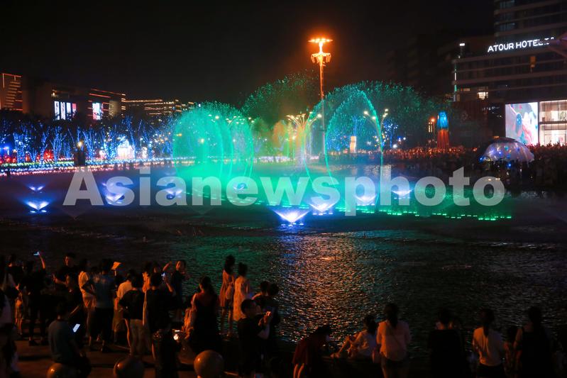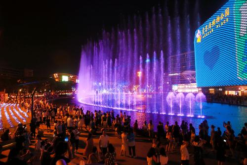 2021年7月17日,上海,爱琴海购物公园的音乐喷泉艺术水秀夜景吸引众多市民和消费者驻足观赏。