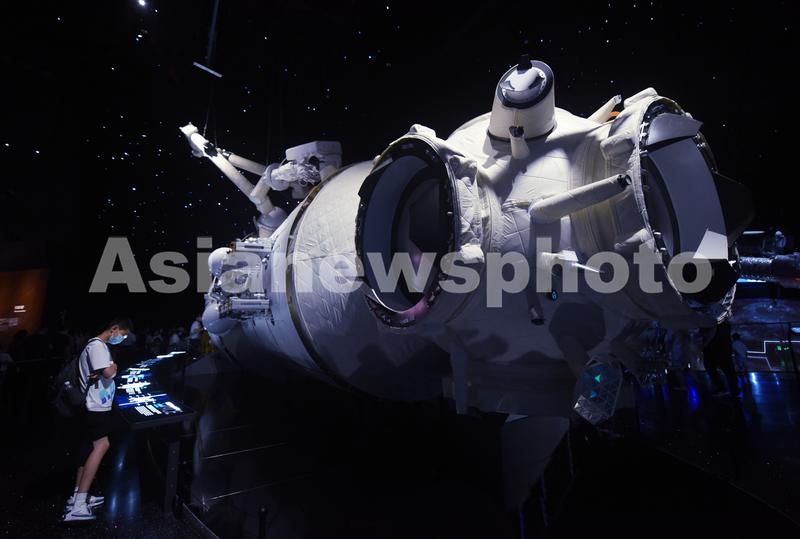 图片说明:2021年7月18日,观众在上海天文馆参观“天和号核心舱”。