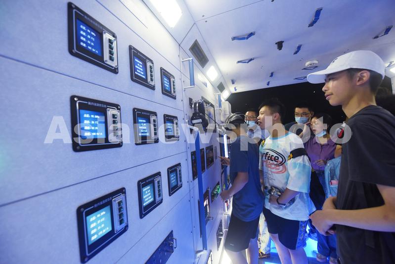 图片说明:2021年7月18日,观众在上海天文馆参观“天和号核心舱”。