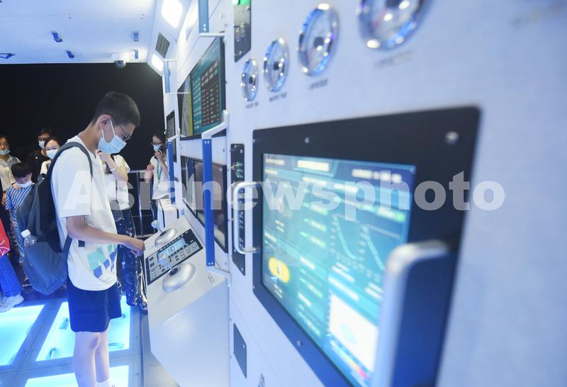 图片说明:2021年7月18日,观众在上海天文馆参观“天和号核心舱”。