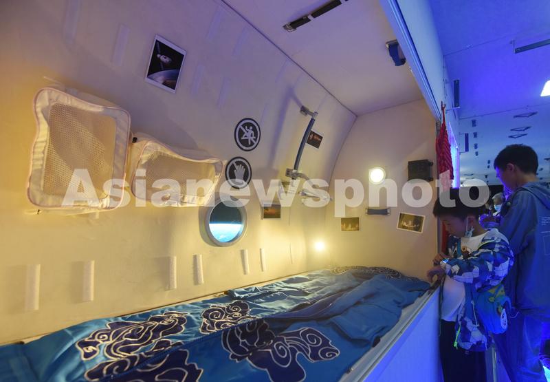 图片说明:2021年7月18日,小观众在上海天文馆参观“天和号核心舱”的“宇航员睡眠区”。