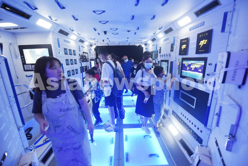 图片说明:2021年7月18日,观众在上海天文馆参观“天和号核心舱”。