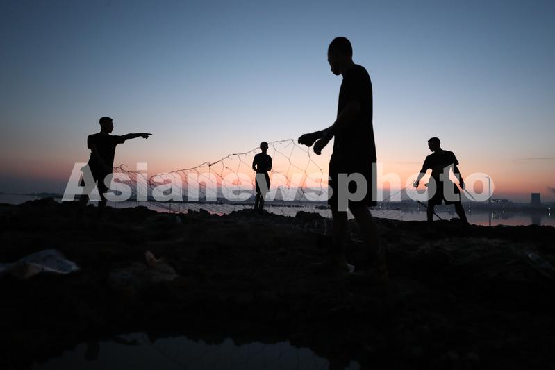 图片说明:7月24日晚,由于单个沙袋封堵效果不明显,武警官兵利用铁丝网捆绑多个沙袋形成土方进行封堵作业。