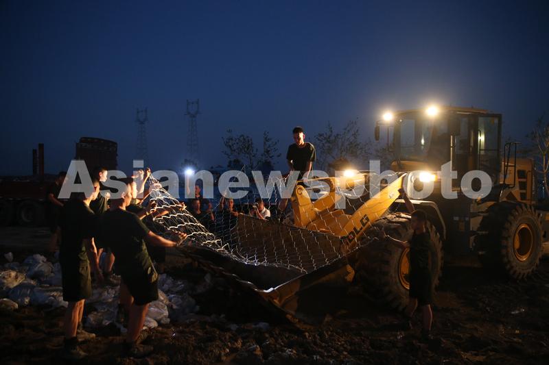 图片说明:7月24日晚,由于单个沙袋封堵效果不明显,武警官兵利用铁丝网捆绑多个沙袋形成土方进行封堵作业。