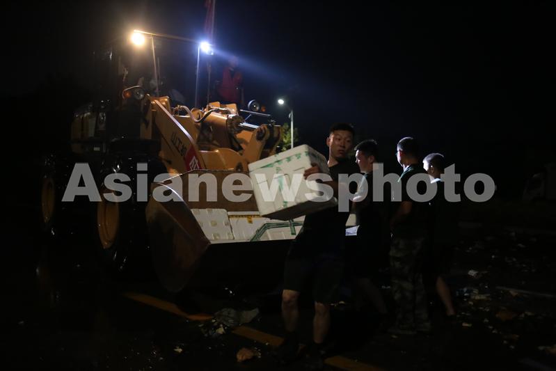 图片说明:7月24日晚,驻守堤坝的武警收到民间捐赠的水果。