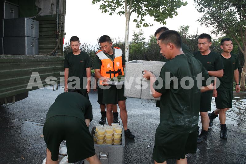 图片说明:7月24日,联勤保障部队的战士为驻守堤坝的武警送晚饭。