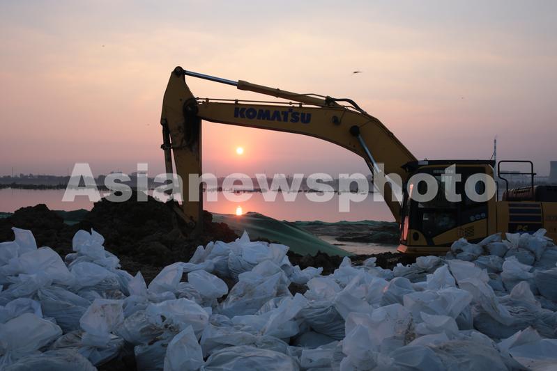 图片说明:7月25日晚,共产主义渠旁堆放的沙袋。