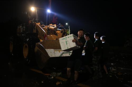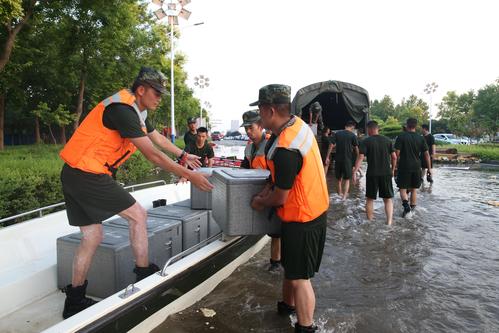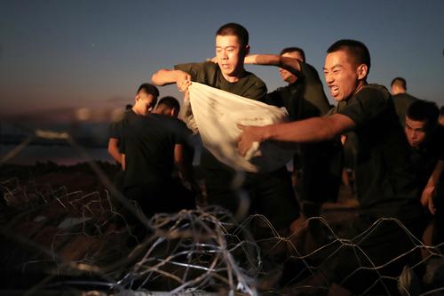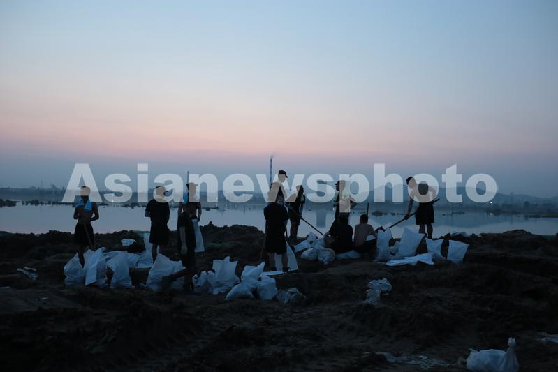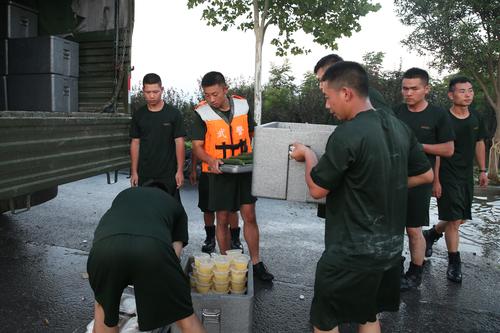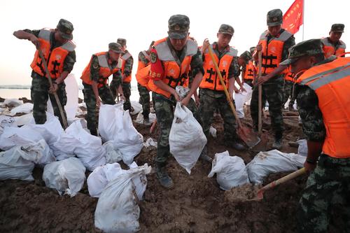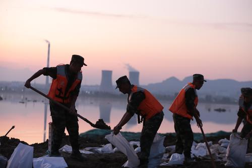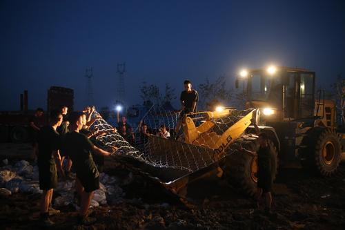 图片说明:7月25日晚,武警官兵搬运砂石袋封堵决口。